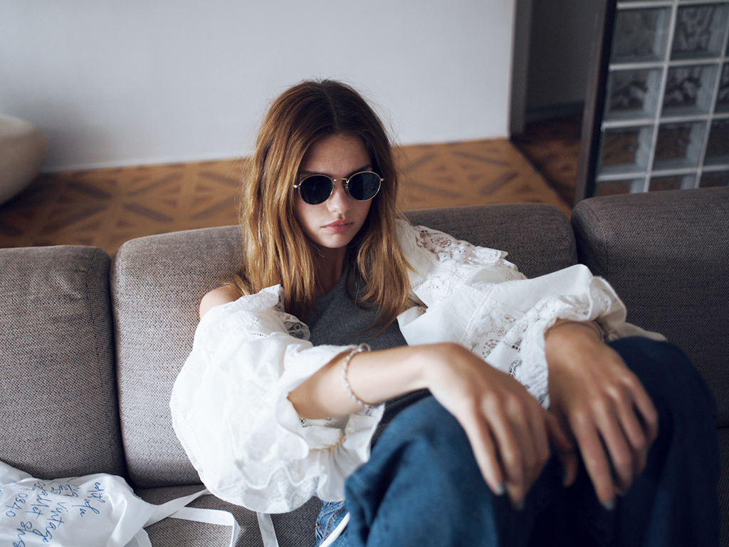 白ワイドデニムパンツ 28,600円/THE SHINZONE(Shinzone ルミネ新宿店) 白ショート丈ポロシャツ(オンライン限定) 5,990円/Gap 眼鏡 59,290円/MIU MIU(ルックスオティカジャパン カスタマーサービス) 〈右手人さし指&中指〉シルバーダブルリング 38,500円、〈左手人さし指〉ゴールドウェーブリング 14,300円/ともにラムダ