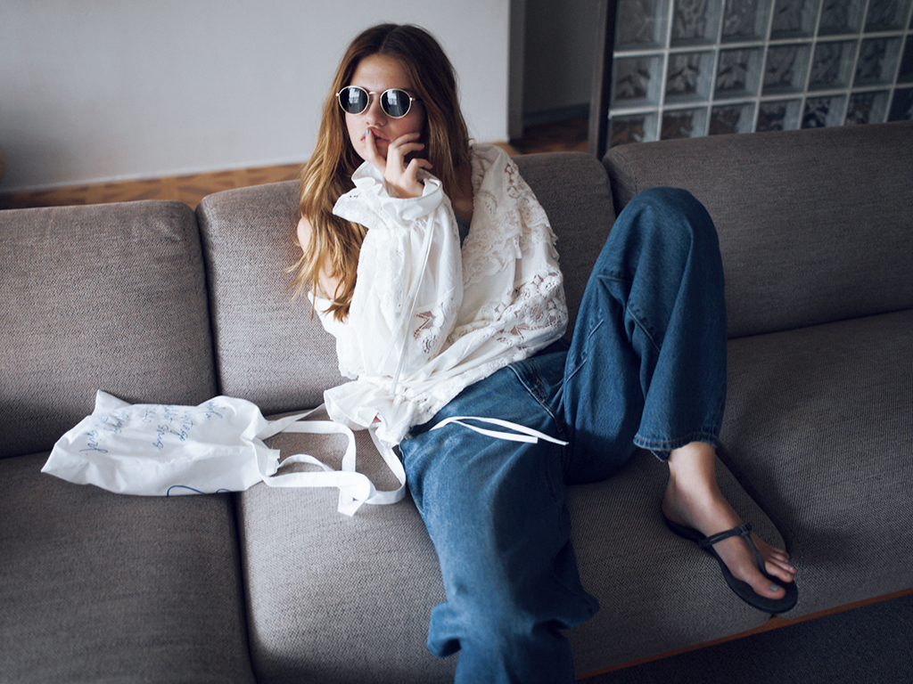 ブルーワイドデニムパンツ 14,300円/リーバイス® フォア ジャーナル スタンダード(ジャーナル スタンダード 自由が丘店) グレーリブタンクトップ 6,600円/SLOBE IENA(SLOBE IENA 自由が丘店) 白レースボレロ 16,995円/フリーダ(フリークス ストア渋谷) 白ロゴトートバッグ 5,280円/エディット フォー ルル グレースエードサンダル 20,900円/ラオコンテ(エディット フォー ルル) サングラス 39,600円/NOCHINO OPTICAL(NOCHINO OPTICAL南青山本店) シルバーチェーンブレスレット 31,900円/ラムダ