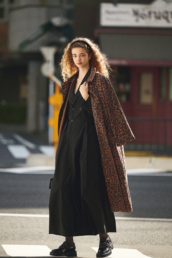 黒ジャケットドレス 69,850円/ロエフ(TABAYA United Arrows) レオパード柄コート 57,200円/THE TINY BIG SISTER(THIRD MAGAZINE) ヘアバンド 30,800円/ALEXANDRE DE PARIS(アレクサンドル ドゥ パリ GINZA SIX店) バッグ 56,100円/VASIC(ヴァジックジャパン) シューズ 69,300円/SACRA(インターリブ) ソックス/スタイリスト私物