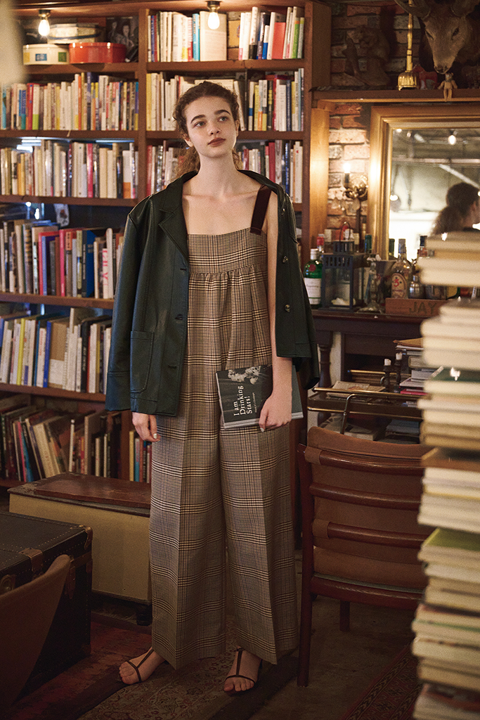 チェックワイドコンビネゾン 33,000円/TODAYFUL(Life’s 代官山店) 黒レザージャケット 59,400円/BAUM UND PFERDGARTEN(S&T) サンダル 49,500円/TOKYO WEEKLY JOURNAL(バロックジャパンリミテッド)