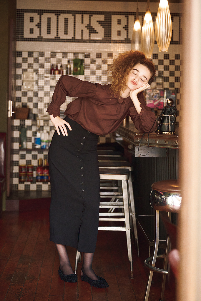 茶ブラウス 25,300円/normment(ショールーム セッション) 黒スカート 30,800円/ウィム ガゼット(ウィム ガゼット ルミネ新宿店) ピアス 13,200円/DOUBLE STANDARD CLOTHING(フィルム) バッグ 67,100円/ZANCHETTI(ショールーム ロイト) シューズ 27,500円/TSURU By MARIKO OIKAWA ソックス/スタイリスト私物
