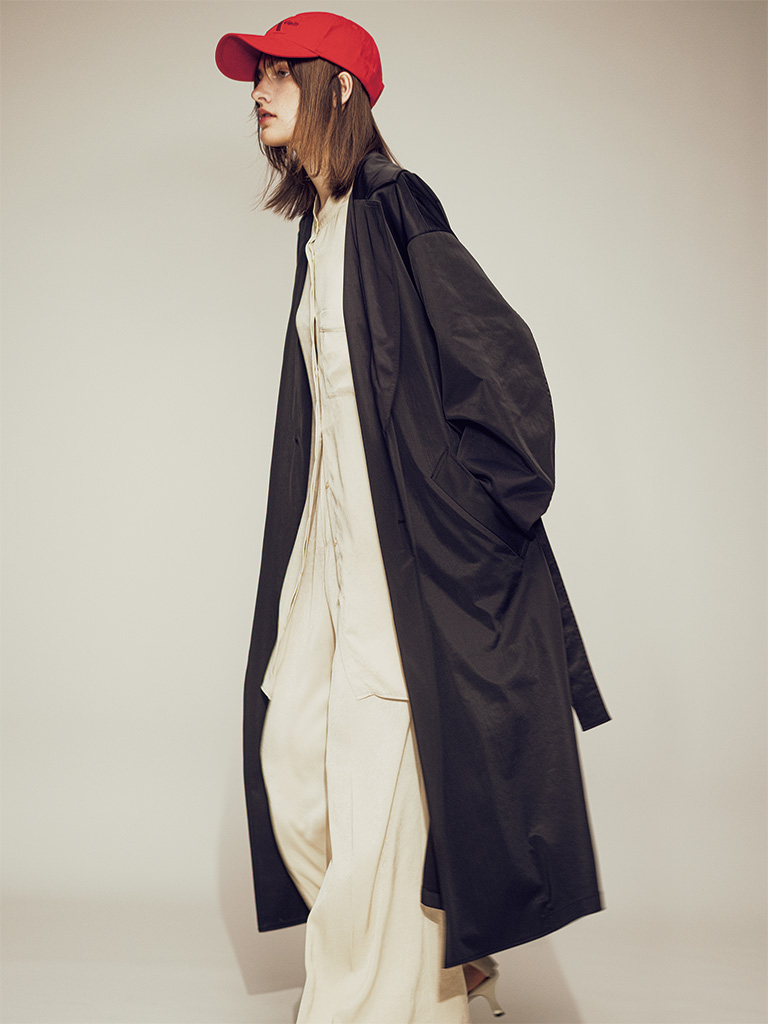【POINT】シックな黒&微光沢のロング丈で成立する「洗練されたトラッド感」。オーバーサイズに中はサテンのシャツ×パンツで、さらなる落ち感を意識。