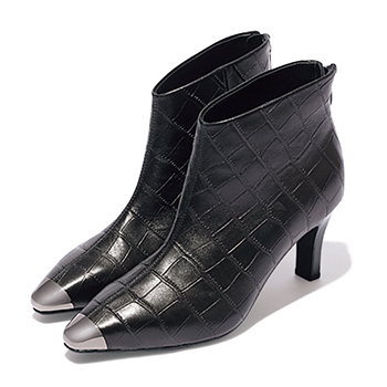一見シンプルな黒ブーツに、奥行きをもたらすクロコの型押し。この「無地以上・柄未満」という絶妙なバランスが、コーディネートを選ばず、無難も回避。つま先に効かせたシャープなシルバートゥは、黒一色に抜けを生むと同時に、レトロなムードをモダンに引き締めるアクセント。高めの7.5cmヒールで、スタイルアップも抜かりなく。
