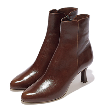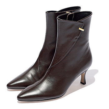 いつものブラウンを、ほんのり赤みがかった「ビターブラウン」へ。それだけで、足元に微糖な甘さと女性らしいやわらかさが宿る。マイルドな色みに加え、きゅっとくびれたヒールが、後ろ姿までレディに演出。黒ほど強くなく、ベージュよりもしっかり締まる。この絶妙な色合いこそ、重くなりがちな秋冬の装いに「ちょうどいい」抜けと差し色として機能。