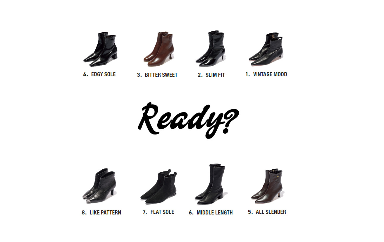 欠かせないショートブーツだから、最短ルートで理想の1足に出会いたい。惹かれる「色」、服に好都合な「形」、やぼったく見えないヒールやソールの「幅」。3つの基準をパスした精鋭が集結。 ※( )内の数字はヒールの高さで、単位はcmです。