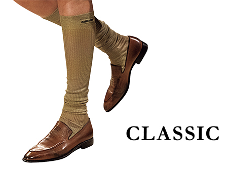 「トラッドなローファーに、カーキのハイソックス。ブラウンのトーンに奥行きを生むだけでなく、ソックスをつなげてロングブーツのように見せる簡単ですぐにとり入れられるテクニック」(出口さん)