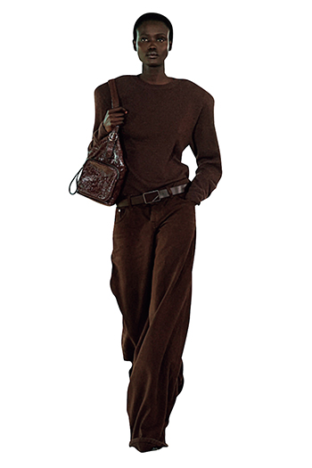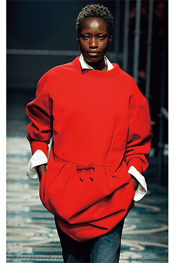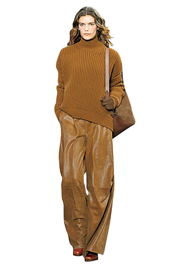 「全身ニットでも膨張して見えないのは、計算されたシルエットとリブの縦落ち感があるから。あえてボリュームのあるファー小物を頭と足先に持ってくることで、全体のバランスを締めている点も巧み。Iラインを意識させつつ、先端で遊ぶ好例」(塚田さん)