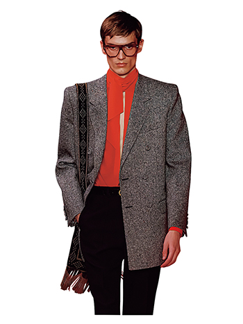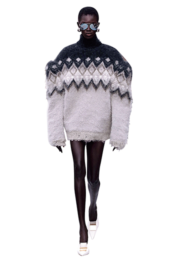 「どこか懐かしさの残るダッドな柄ニットが、アグネらしい極端なBIGサイズで登場。ともすれば野暮ったくなりがちなアイテムを、この思いきりのいいメリハリで一気にモードへ転換させているのがポイント。この大胆なシルエットこそが、今季のグレーを更新する鍵」(船戸さん)