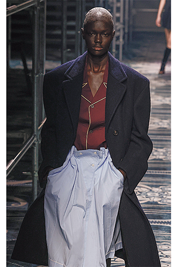 白をメインにしない。ダークカラーや主張の強い色に対し、あくまで「抜け役」として白を少量効かせる。PRADAが「未完成の美学」をテーマに掲げた今季、この「小さな白」でルック全体を引き算する提案に注目。
