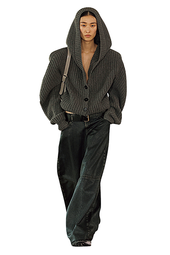 「ざっくりとしたローゲージのニットカーデに、深く開いたVネックが気だるさを誘う。今季多く見られたフードつきのリラクシーなデザインも、チャコールグレーで引き締めれば、だらしなくならず『適度な脱力感』に落ち着く。この大人の余裕を感じさせるバランスが重要」(渡邉さん)