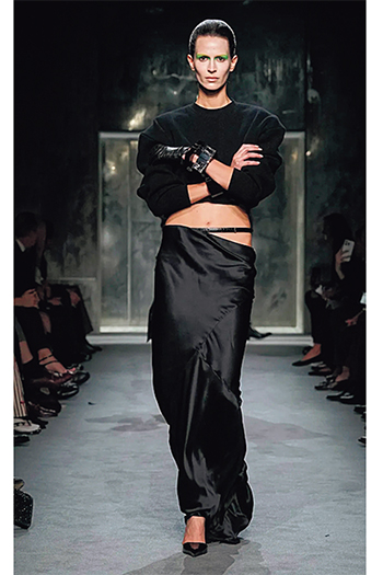 「トム フォードは、つややかなサテンと短丈をかけ合わせたALL黒で、力強いフェミニティを表現。これも、あえて秋冬らしい重さのある素材で肌見せするバランスが新鮮。黒の強さを、よりセンシュアルに昇華」(塚田さん)