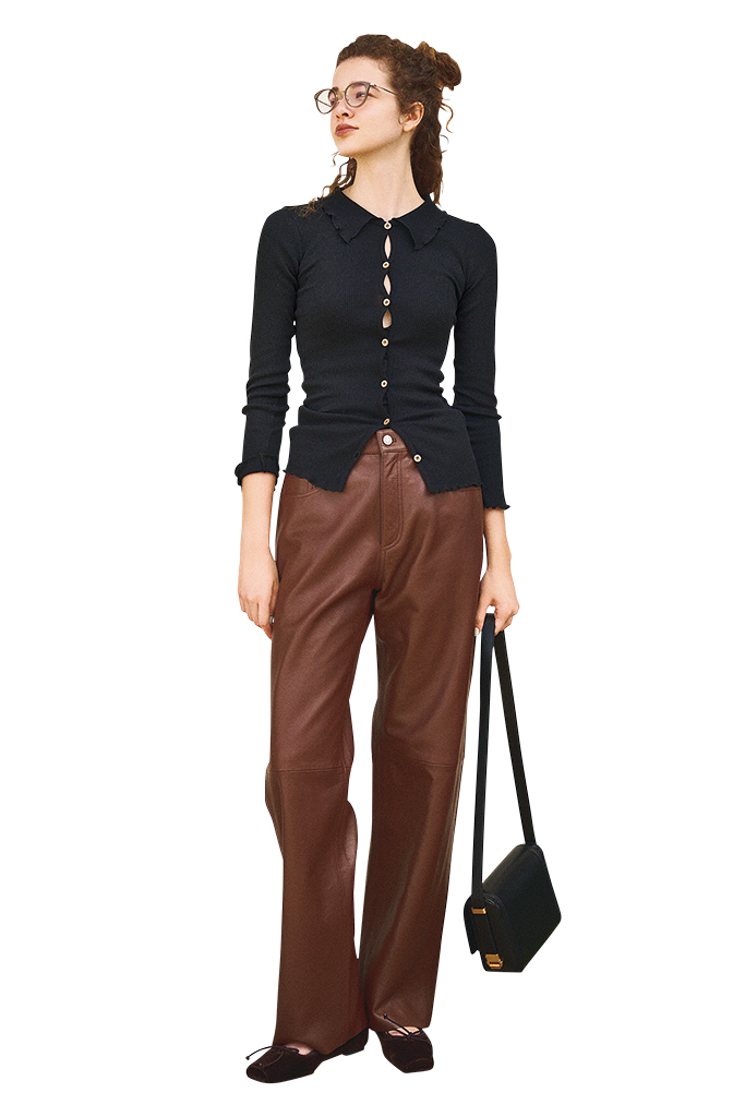 黒カーディガン 29,040円/BASERANGE(エディット フォー ルル) 茶レザーパンツ 119,900円/HAIKURE(ショールーム ロイト) 眼鏡 46,200円/プロポ(プロポデザイン) バッグ 192,500円/スーザン サツマリー(ユナイテッドアローズ 渋谷スクランブルスクエア店) シューズ 26,400円/TSURU By MARIKO OIKAWA インナー/スタイリスト私物