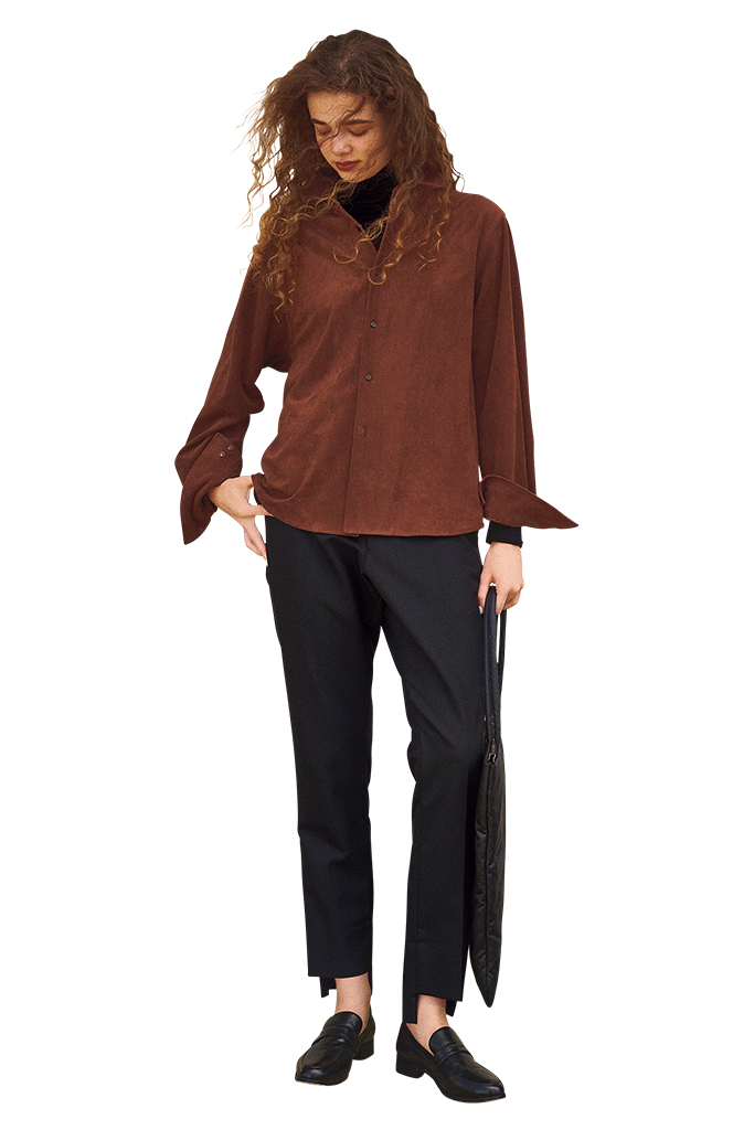 中に着た黒タートルネックトップス 15,400円/LE PHIL(LE PHIL NEWoMan 新宿店) 茶スエードシャツ 34,980円/エイチ ビューティー&ユース 黒サイドラインパンツ 38,500円/カオス(カオス表参道) バッグ 21,670円/ザ・パース(プレインピープル青山) ローファー 16,390円/A de Vivre