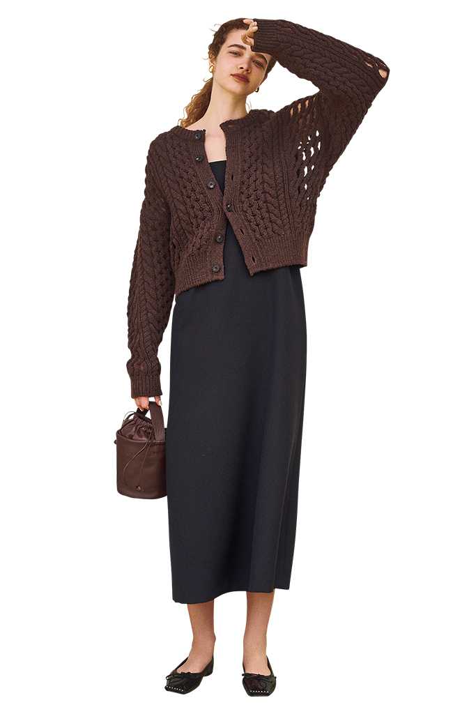 茶ニットカーディガン 45,980円/エイチ ビューティー&ユース 黒キャミワンピース 27,500円/ウィム ガゼット(ウィム ガゼット ルミネ新宿店) イヤリング 5,670円/アビステ バッグ 66,000円/thehighlights シューズ 40,700円/チェンバー(ユナイテッドアローズ 渋谷スクランブルスクエア店)