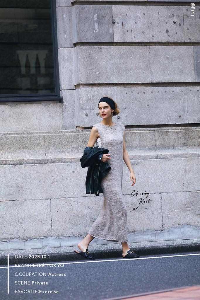 体へのほどよいフィット感とノースリーブから伸びる腕が、想像力をかき立てるニット素材のあざとさ。つつましきベージュなら、露骨なセクシーさとは無縁。