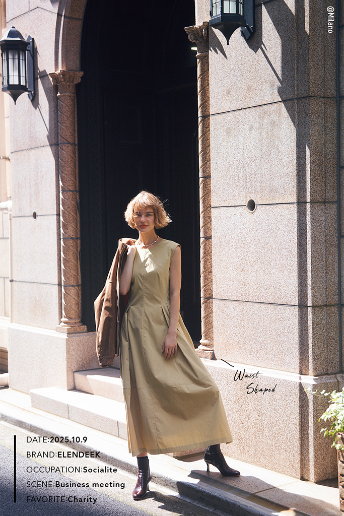 きちんと感と安心感が特徴のワンピース。そこへさらに、こなれて見えるデザイン性も含ませていつもより「ちょっと上」の装いへ。