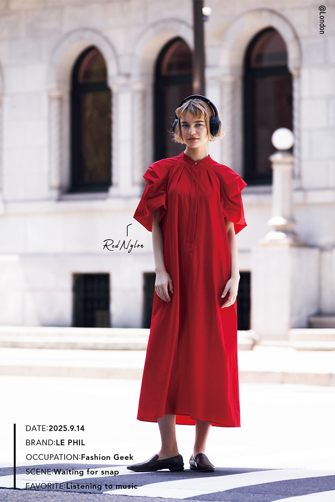 フリル見えする構築的なタックスリーブを、スポーティなナイロンで表現した糖度をおさえる好バランス。強気な赤でまとっても、質感のおかげでほどよくカジュアル。レディを象徴するドレスに相対した、メンズなローファーを無造作に。なじみのいいブラウンをセレクトすることで、赤の発色を落ち着かせて。
