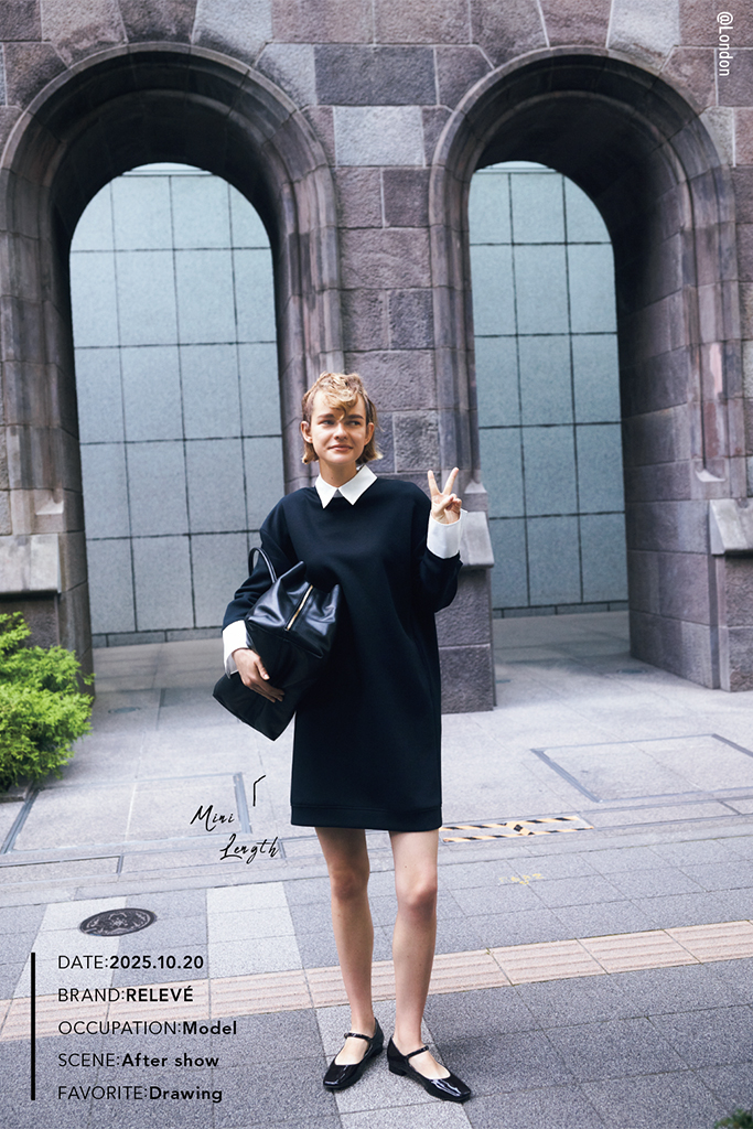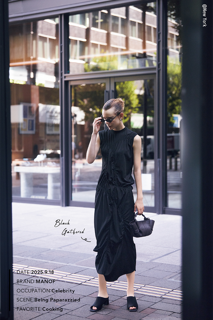 サイドをつまんだような構築的なフォルムと、横顔や後ろ姿まで美しく見せる計算されたドレープ。あいまいなそで丈や落ち感のある素材のニュアンスによって、モード手前のバランスに。ワンピースに特徴があるぶん、小物も黒で統一。
