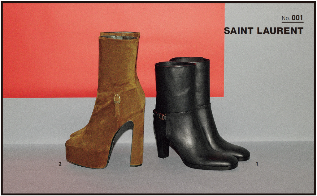 2.プラットフォームブーティ(10.5) 341,000円 存在感のあるプラットフォームソールが特徴。きめ細かいスエードがクラス感を引き上げ。内側にあしらったジッパーで着脱が簡単。/ともにサンローラン バイ アンソニー・ヴァカレロ(サンローラン クライアントサービス)