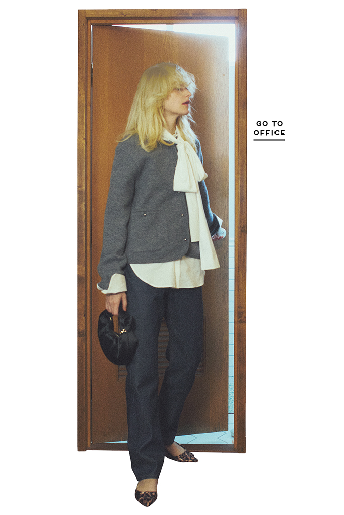 強縮絨加工をほどこしたことで型くずれしにくい。ボウタイブラウスでクラシックに寄せても抜けを保てるのは素材のおかげ。