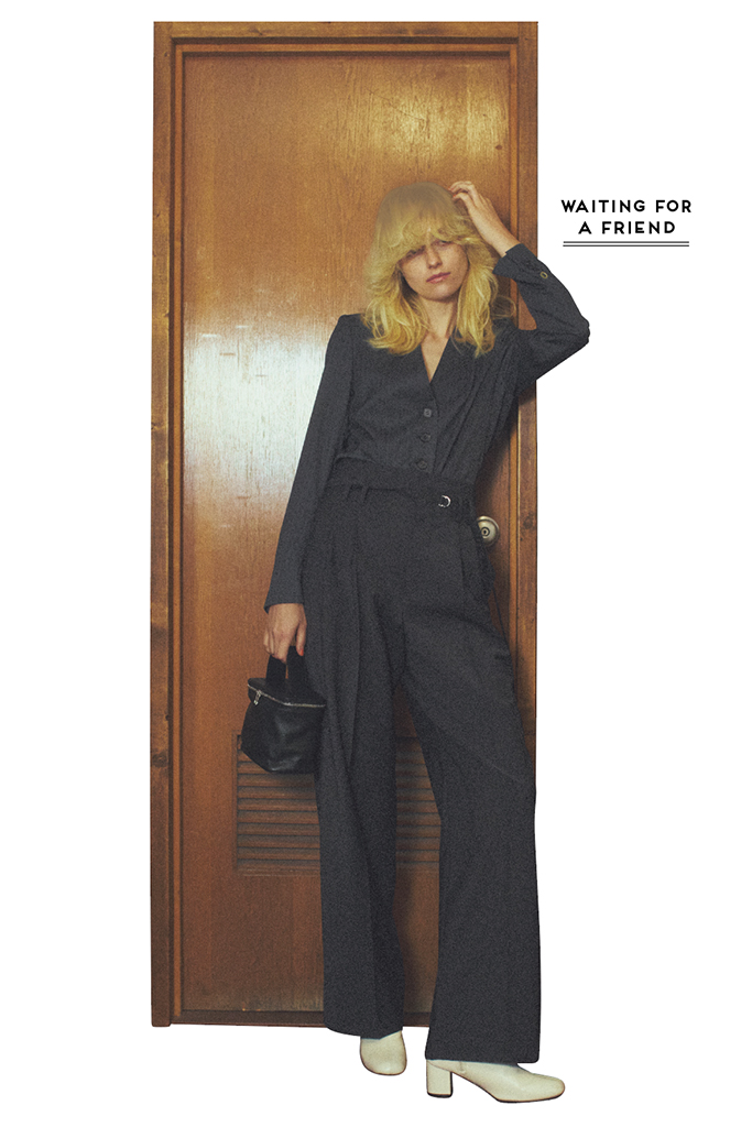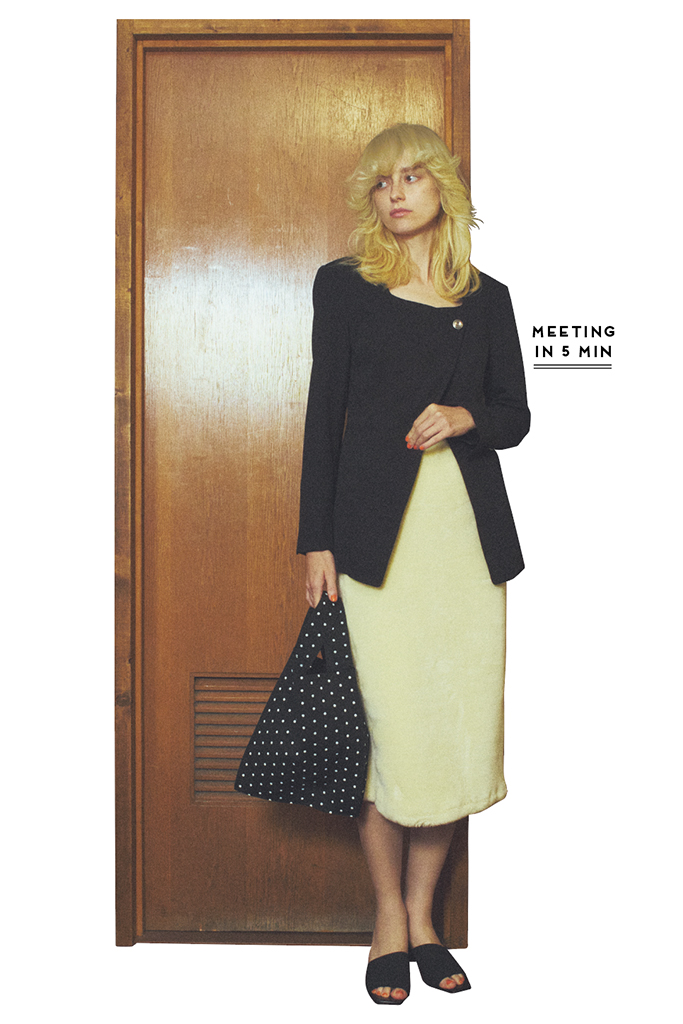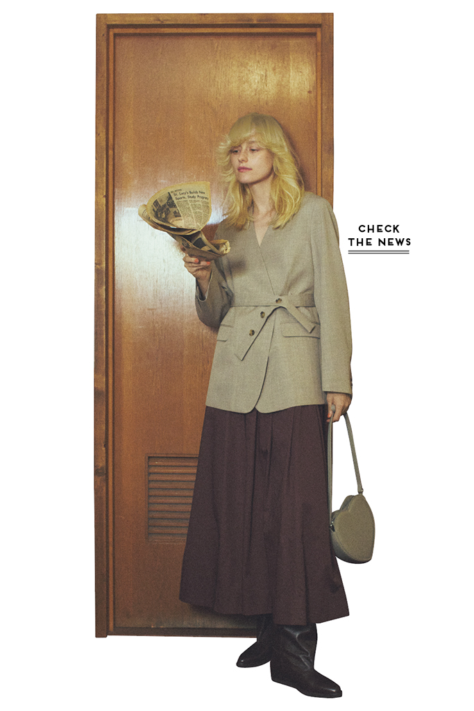 ボタンをとめることですそが広がり、フロント部分にスリット風デザインが出来上がり。スクエアネックと合わさって、ボトムの形を問わず簡単にメリハリをつけることが可能。エッジが効くぶん、ファースカートのかわいげも許容範囲。