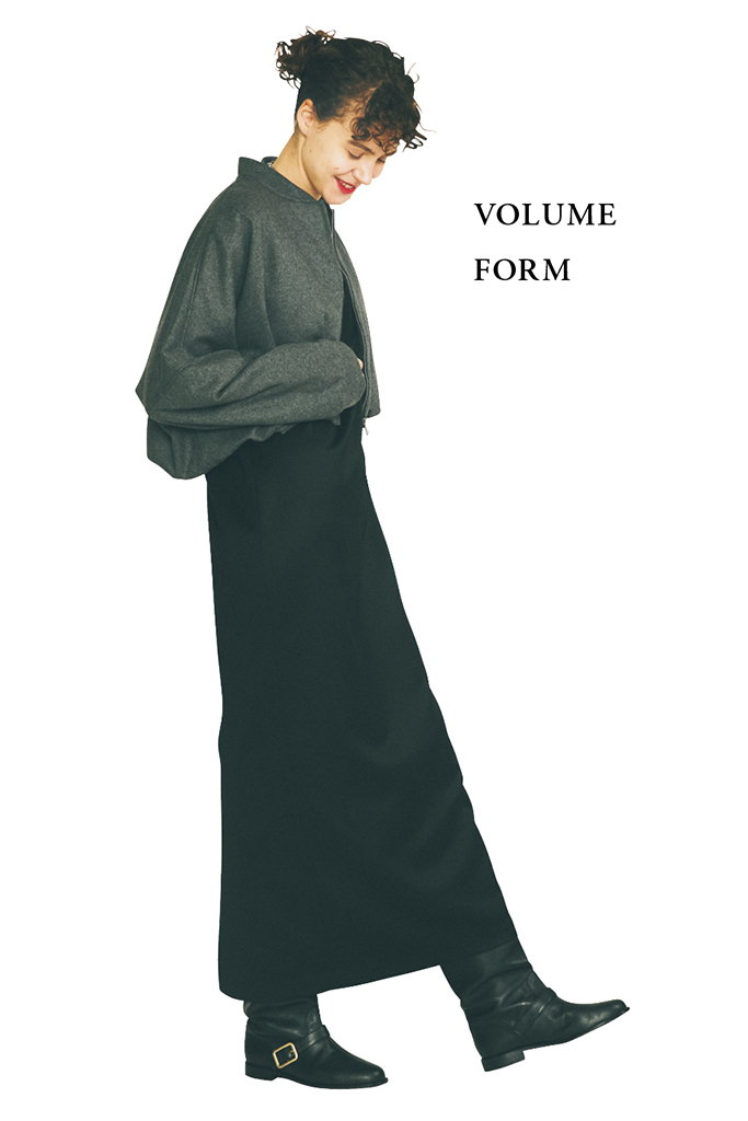 ストイックなALL黒をゆるめる丸みのあるシルエット。肩にかけてなだらかな曲線を描く立体的なフォルムのおかげで、硬派なIラインに緩急が誕生。足元までブーツでつないだ隙のないワントーンに短め丈がメリハリを生み、のっぺり感を回避。ヘアはアップにまとめ、首元をシャープに見せるえり元の直線的なラインをきわ立たせて。