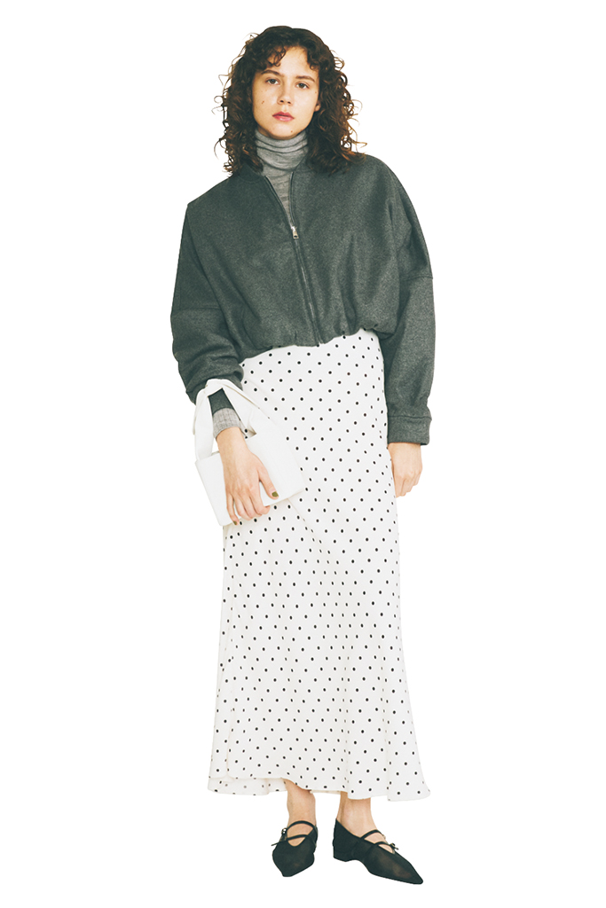 クラシカルなドットの甘さをメンズ要素でカジュアルダウン。ピュアな小粒のドット柄を、無骨なブルゾンでほどよい甘さに調整。ワントーン明るいグレータートルを仕込んで奥行きをメイク。