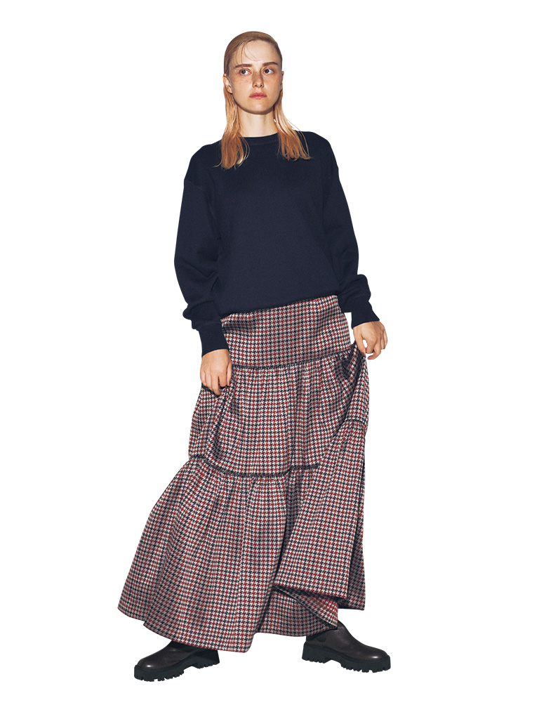 普通のトップスでもさまになる、ダイナミックなゆれ感のティアードスカート。色の中でも引き締め力の高い赤と黒を細かく散りばめることで、派手さなくシルエットの甘さをそぎ、なつかしくも大人っぽい印象に。模様自体にキレのある千鳥格子柄もほっこりせず使いやすいポイント。