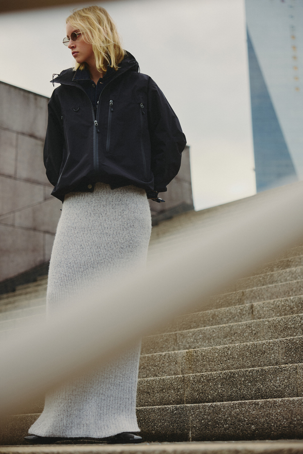 ジャケットのすそを絞ったショート丈トップスのような着方で、ロングスカートの脚長効果をよりアピール。マットなツヤを放つキレのいい黒がドライなニットスカートの間のびを防ぎ、メリハリのいい見た目に。防風・透湿性に優れながら薄手で軽快なゴアテックス素材のため、中にデニムジャケットを仕込んでももたつき感はなし。