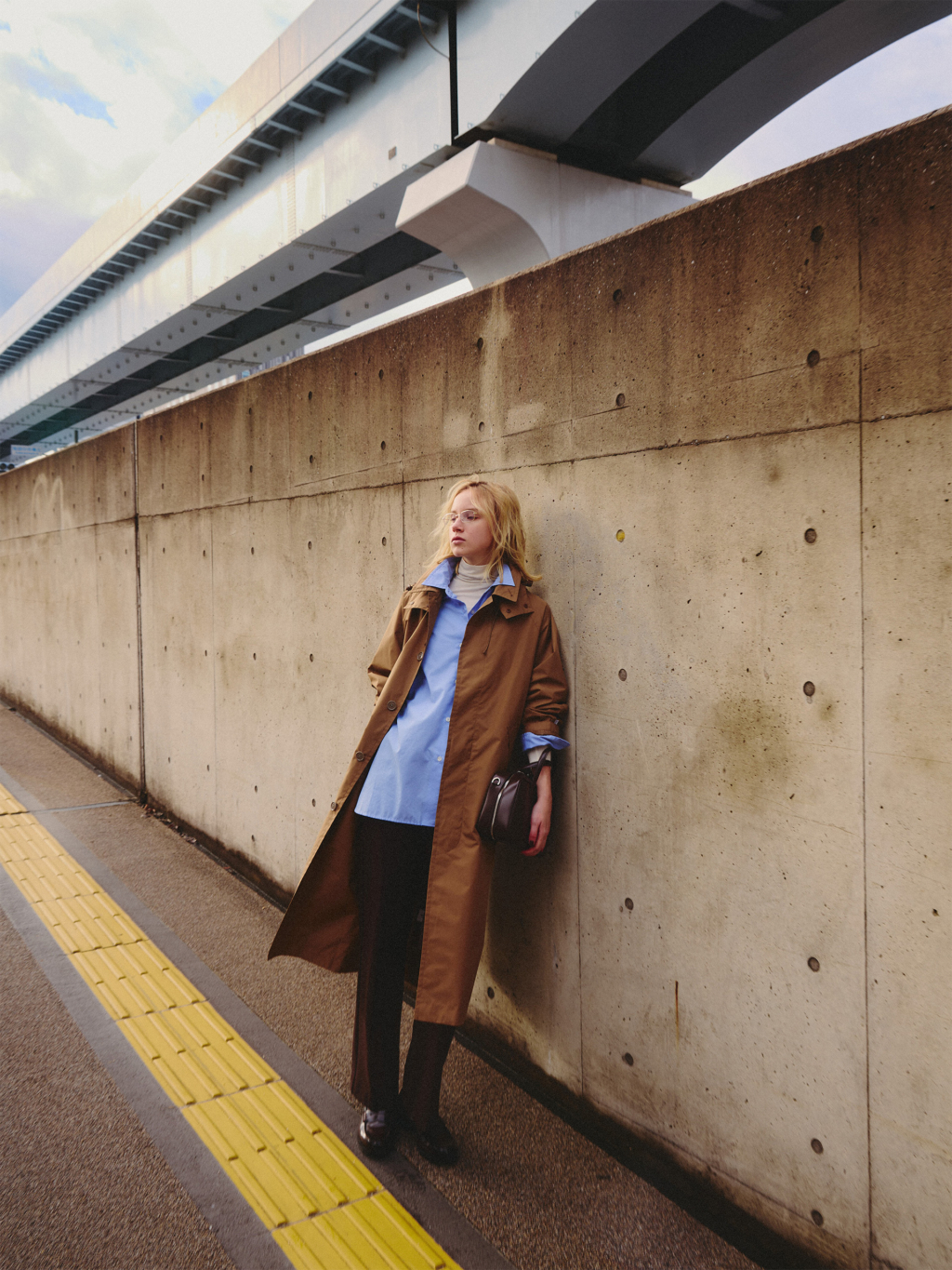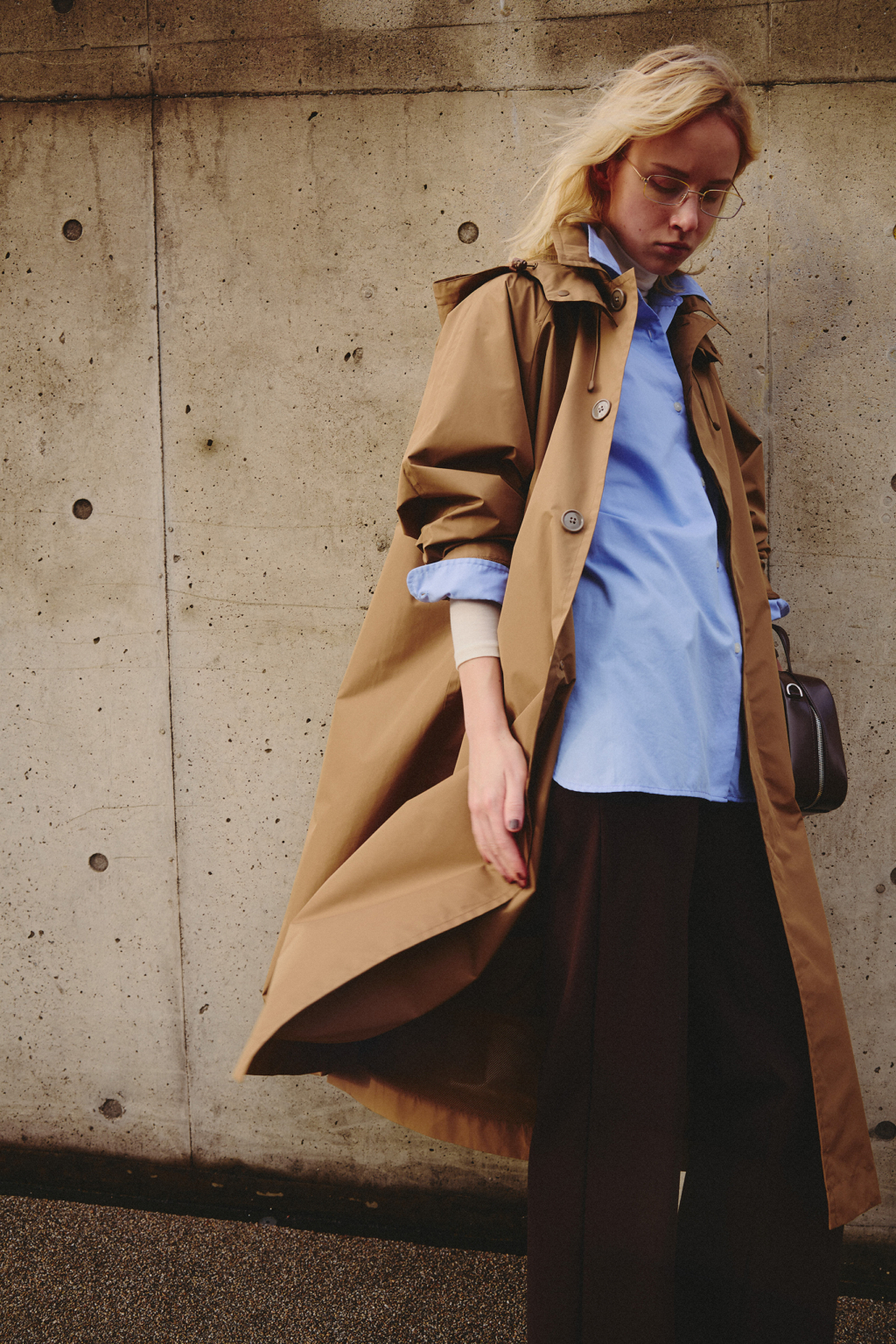 バサッと羽織ってもクラシックなムードを貫ける、トレンチコートのようなブラウン。シャリっとしたゴアテックスの質感が、茶系でよくあるほっこり感を上手にセーブ。シャツ+パンツのインテリな装いとも好相性な直線フォルムで、カジュアルを感じさせないスマートな仕上がり。冷気をシャットアウトできるうえ、疲れず着続けられる軽やかなロングコート。