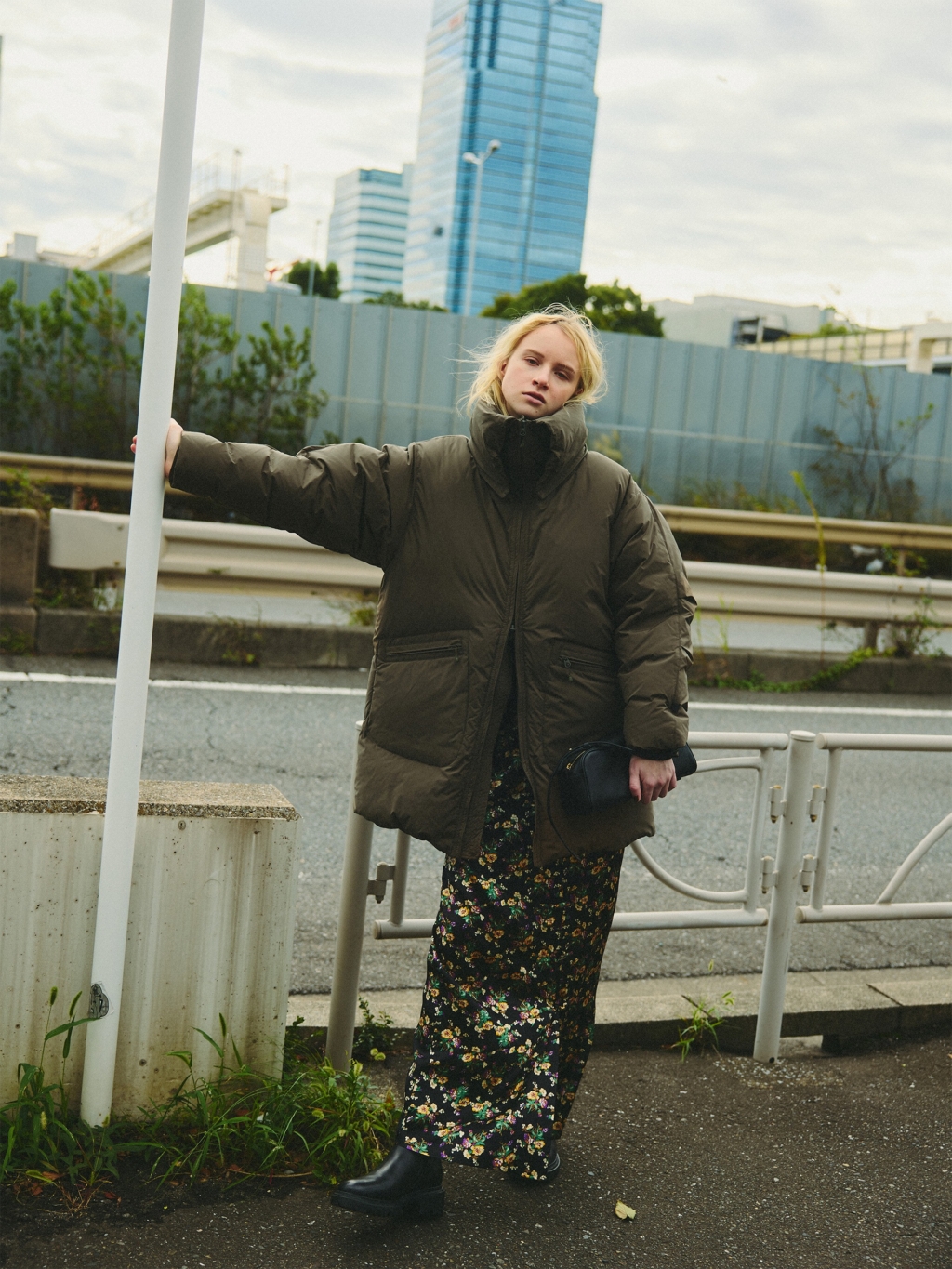 着るというより包まれるほどの立体シルエットなら、総柄スカートの個性にも難なくつり合う好結果。無骨なビッグフォルムやカーキの辛さが花柄の甘さを削ぎつつ、繊細な女性らしさだけを引き立ててくれる。ダウンのすそを内側に折り畳めば、ショート丈としても着用可能。顔が埋もれるほどのスタンドカラーは、ボタンをはずしてジップを閉めるとボリューミィなフードに変身。