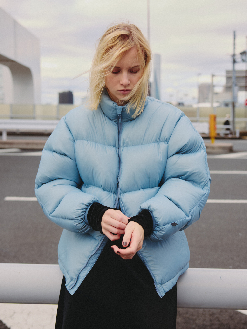黒のワンピースに、さらに黒コートは強すぎるから。あえて真逆のぷっくり丸いシルエットの白みがかったパステルブルーを選択。ダウンの可愛げが功を奏し、ドレッシーな質感がやわらいでちょうどいいあんばいに。超軽量生地ながら丈夫で破れにくいという、可愛い見た目をいい意味で裏切る本格派。