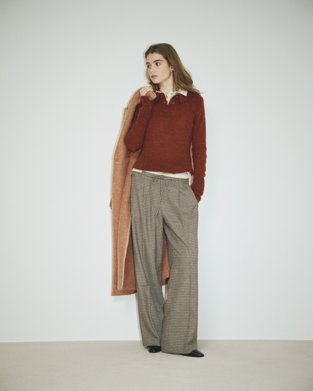 「注目のポロデザイン。大きめサイズだとボーイッシュな雰囲気に転びがちですが、これはすっきりとした細身かつ、ほんのりシアーなニット感でシーンレスに使えそう。首元から素材違いの白のポロシャツをのぞかせ、紳士的なチェック柄のワイドパンツを合わせることで、暖色の和やかな雰囲気を残しつつ、ハンサムさのあるルックスに。」(渡邉さん)