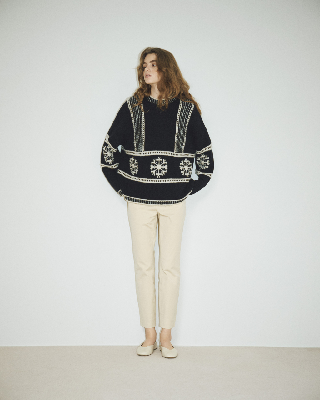 ノルディック柄ニットトップス 22,000円、スキニーパンツ 15,000円、フラットシューズ(一部店舗限定) 30,000円/以上バナナ・リパブリック ワイドとも好相性な、そでもすそもすぼまらない形。うでや背中にも同柄が続き、全方位ぬかりなく。