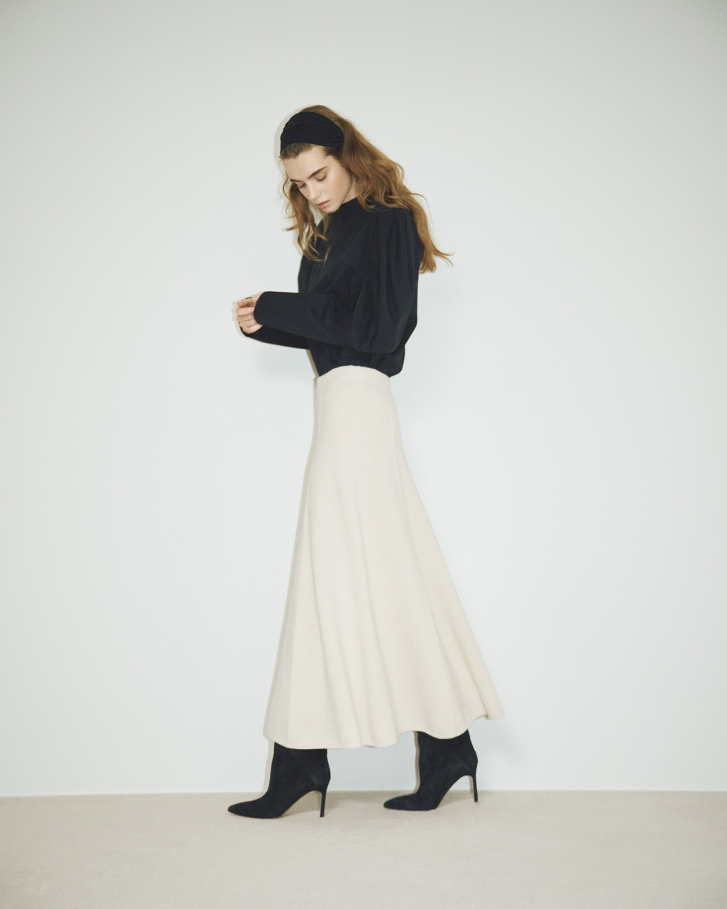 ニットフレアスカート 24,000円、ハイネックブラウス 16,000円、ブーツ(一部店舗限定) 60,000円/以上バナナ・リパブリック 黒ヘアターバン/スタイリスト私物 スカートはメリノウールとコットンの混紡素材。あたたかいのに熱や湿気がこもりにくく、一日中快適な着心地を約束。