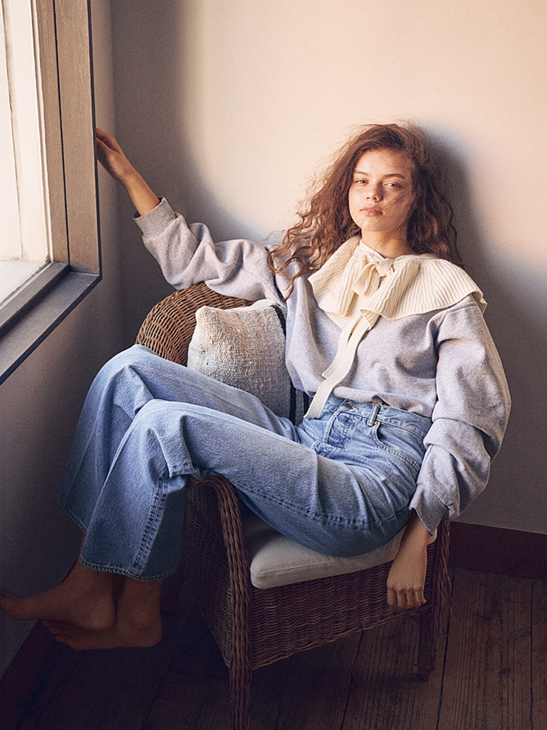 フリルにインパクトがあるぶん、スウェットもオーバーサイズが最適。ニットのやわらかな質感にオフホワイトの色みがマッチして、甘さひかえめな遊び心に。
