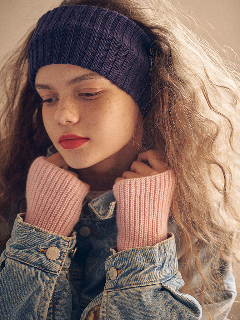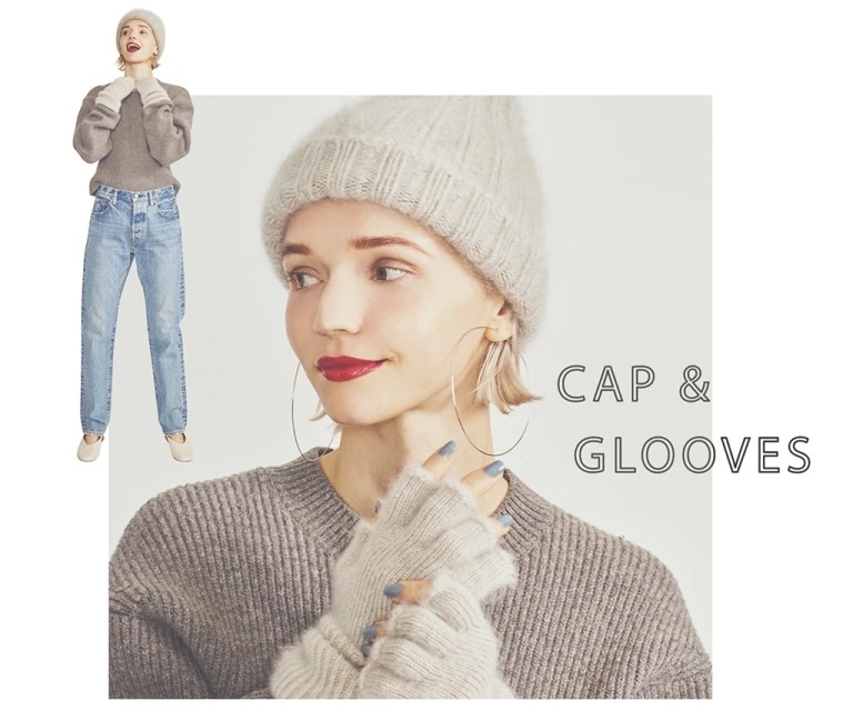 たとえばニットキャップと色味をそろえて。ニット小物の重ねづかいで、いつものベーシックスタイルにひと工夫。スマホ操作などもしやすいオープンフィンガータイプ。