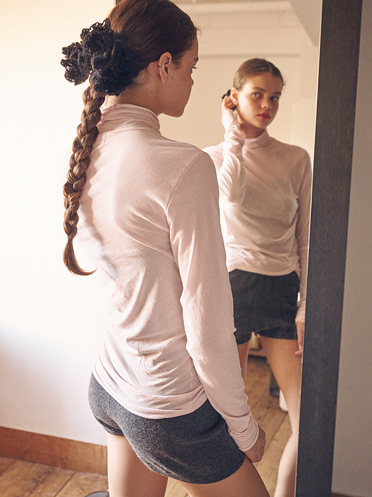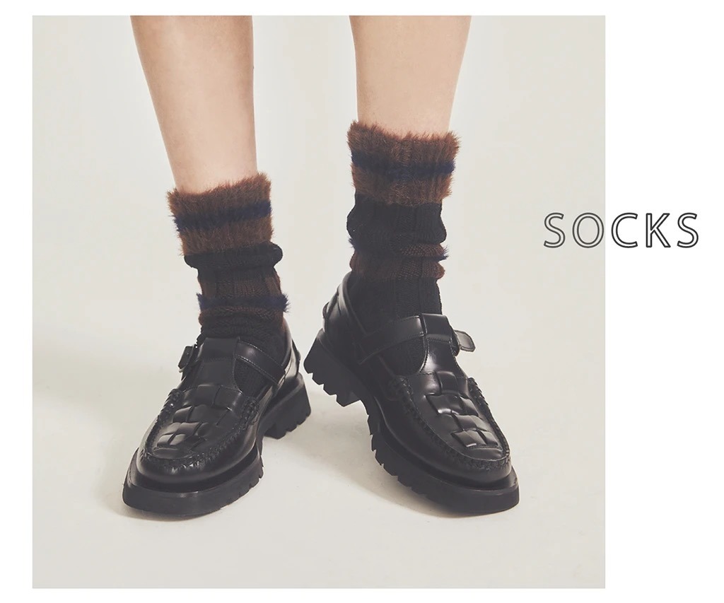Tストラップローファーならではのカットディテールをニットとファーの異素材ソックスで埋めることで、ほどよい抜け感を残したままぬくもりだけをプラス。ローファーの編み目調デザインもソックスとのつながりに一役。ソックスの毛足の長さを生かして、ミニボトムに重みを足したり、ベーシックなスラックスの間からちらりとのぞかせたり、マルチに使えるのもうれしいポイント。