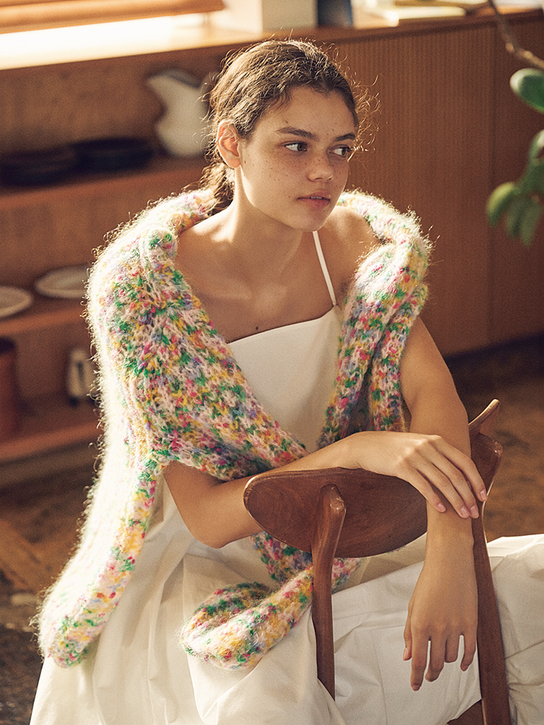 体を包めるボリューミィなカーディガンをストールのように活用。単色よりもむしろ発色が和らぐマルチカラーで、奇をてらわずとも埋もれない個性を引き出せる。
