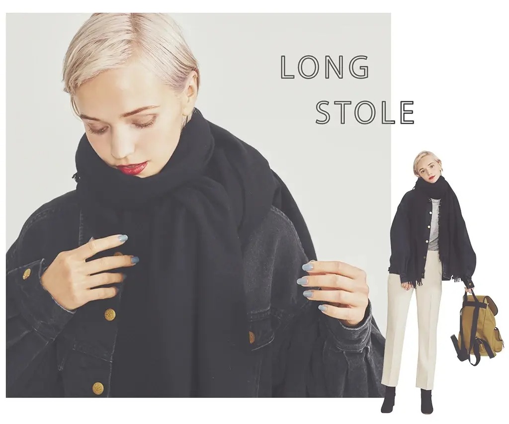 ニットストールのライトな質感と躍動感を演出するフリンジデザインにより、ハリのあるデニムジャケットの強さを中和。巻き方を変えるだけでボリュームのコントロールが可能なところもニットストールならでは。