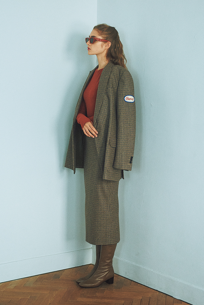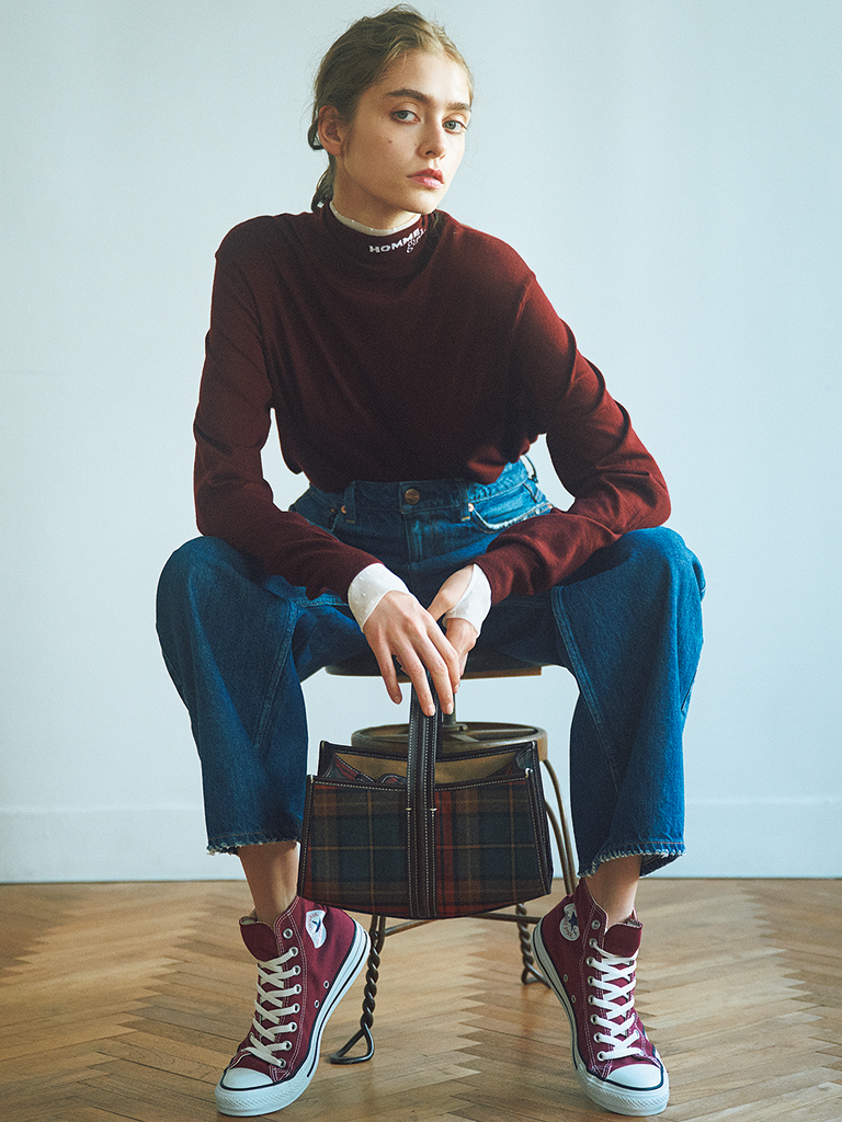 ジャケットにキャップをかぶったボーイッシュなスタイリングにクラシカルなムードをかもす、深い赤のレトロな色み。わずかに明るい赤ロゴTをインナーに採用して、キャップと色をリンクすると、さらにまとまりよくとり込める。