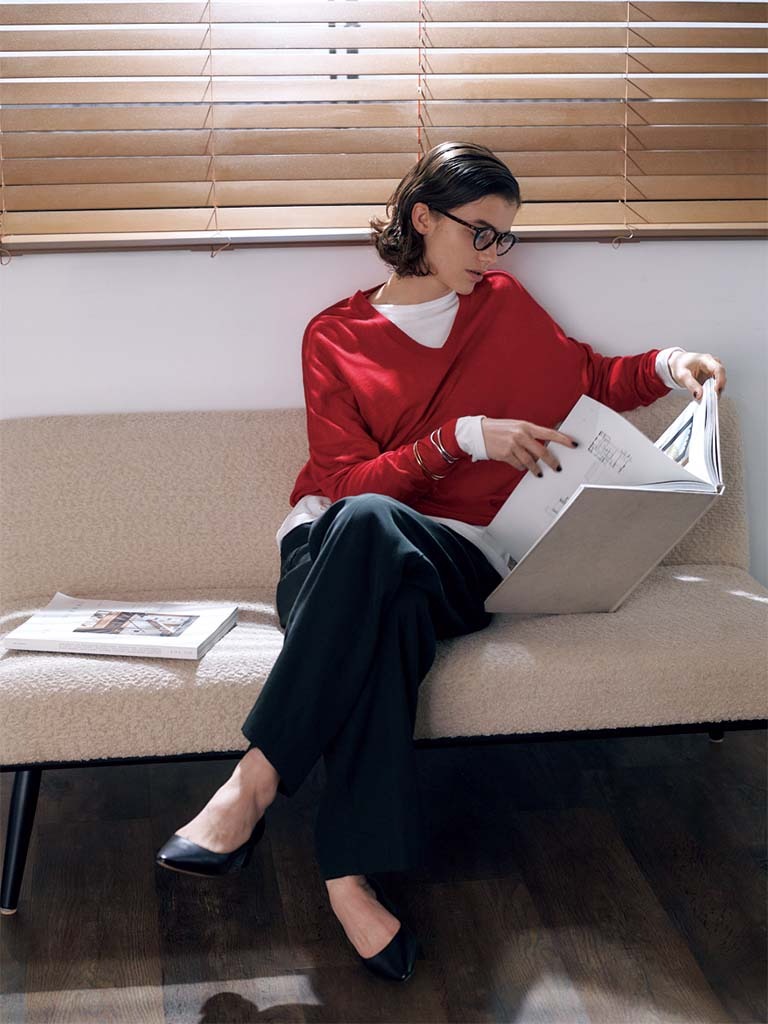 コンサバになりがちな薄手の赤ニットは、バングルやブレスレットを重ねて小さく遊び心を加算。なだらかなVネックからのぞくよう白Tを仕込み華やかさを微調整。