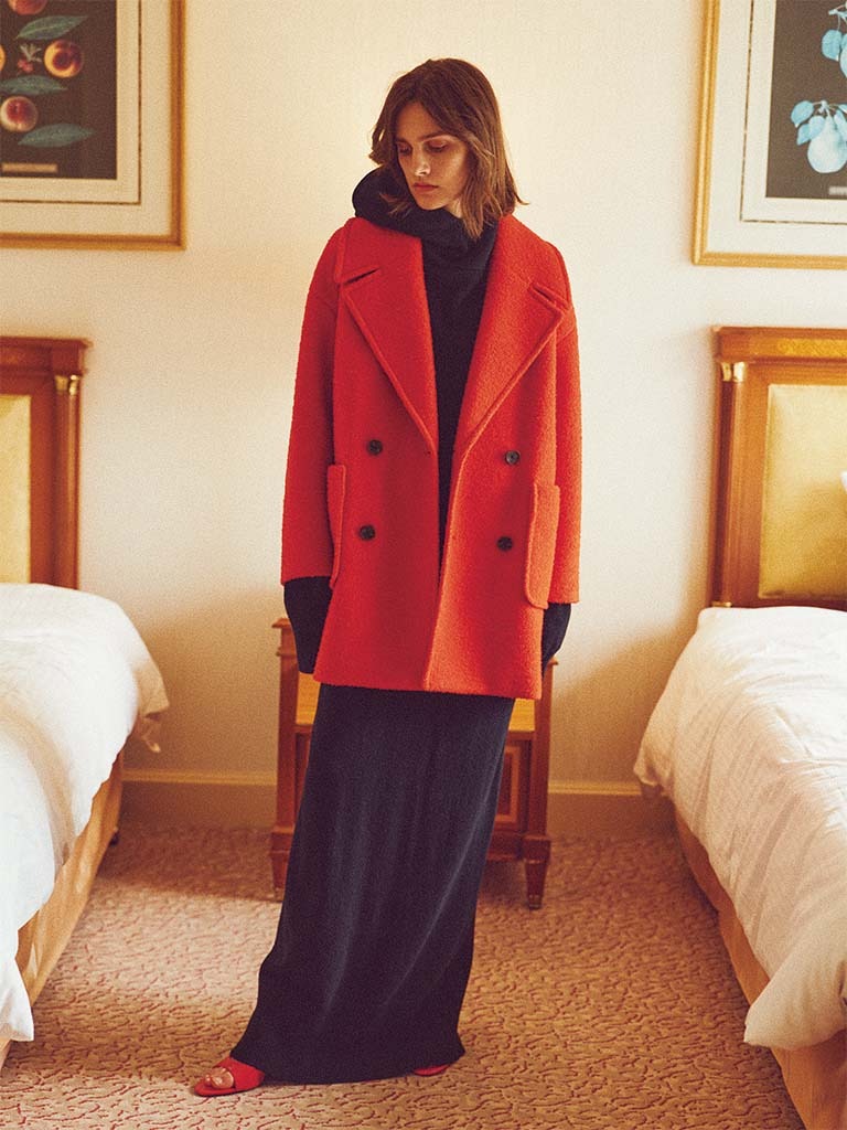 ジャケット感覚で着られるミドル丈のピーコートなら、ヴィヴィッドカラーも派手すぎず目を引くバランス。目立つ色をいちばん外側に置くことで、気楽なワンピースを手間なくドラマチックな見た目に。足元がすっきり整うひざ上丈のコートは、Iラインからフレアまで、ボトムラインを問わず合わせやすい。
