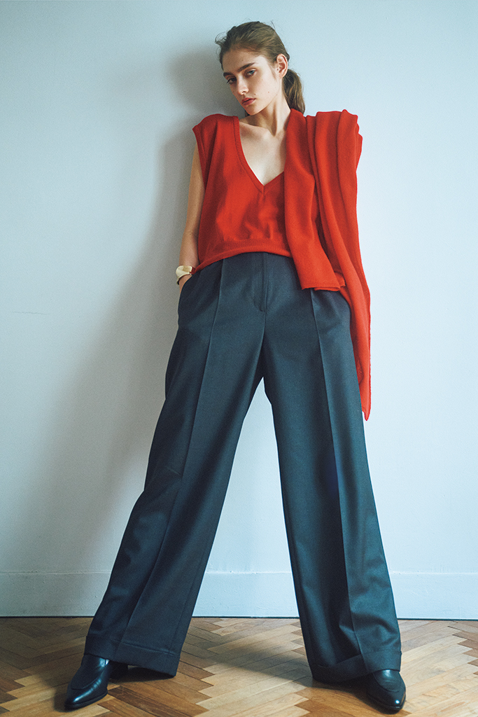 ハンサムなグレーパンツの静けさに意表をつく、鋭く深いVネックの赤ベスト。目の覚めるような赤の迫力は冷静に落ち着き、シンプルな暗色はリュクスに高まる。組み合わせによる相互作用を利用。同色のストールを足してニュアンスをつけ、潔い形の緊張を緩和。