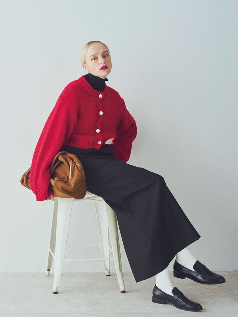 きりっと緊張感のあるイメージだけでなく、愛らしさにも振れる、濃厚な赤のミドルゲージカーディガン。華やかな色のおかげで、大胆なデザインに頼らずちょうどいい女っぽさに。スマートな黒スタイルを丸みのある赤ニットで親しみやすく。