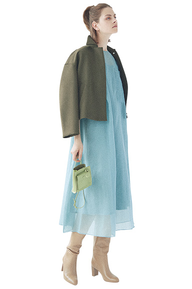 ブルゾンは着まわし。ブルーシアーワンピース 24,000円+税/LE CIEL BLEU(ルシェルブルー 総合カスタマーサービス) バッグ 16,000円+税/マロー(アダム エ ロペ) ブーツ 30,000円+税/DIANA(ダイアナ 銀座本店) ワンピースにはおるアウターをロングからショート丈に変更。