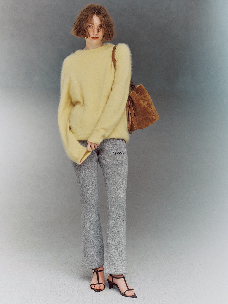 グレーフレアパンツ 33,000円/HOLIDAY(ホリデイ/フラッグシップサロン オフィス) イエローニット 67,100円/ATON(ATON AOYAMA) 中に着た白Tシャツ 9,900円/LE PHIL(LE PHIL NEWoMan 新宿店) バッグ 137,500円/ZANCHETTI(ショールーム ロイト) サンダル 49,500円/TOKYO WEEKLY JOURNAL(バロックジャパンリミテッド)
