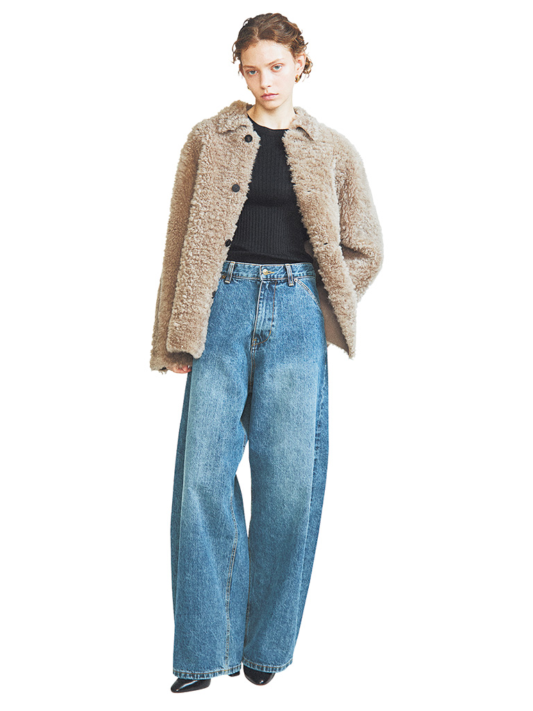 【POINT】穿き込んだようなユーズド加工のデニムがもつそっけなさが、ファーのかわいらしさを中和し落ち着いたカジュアルに落とし込んでくれる。