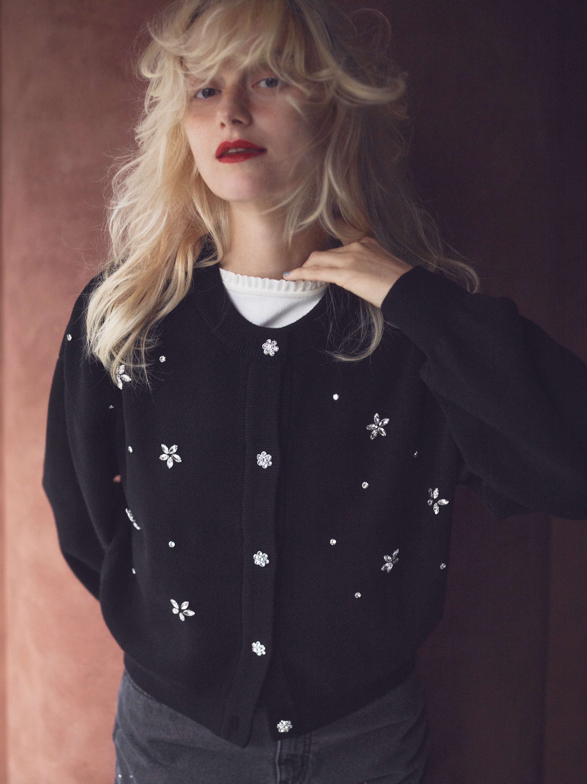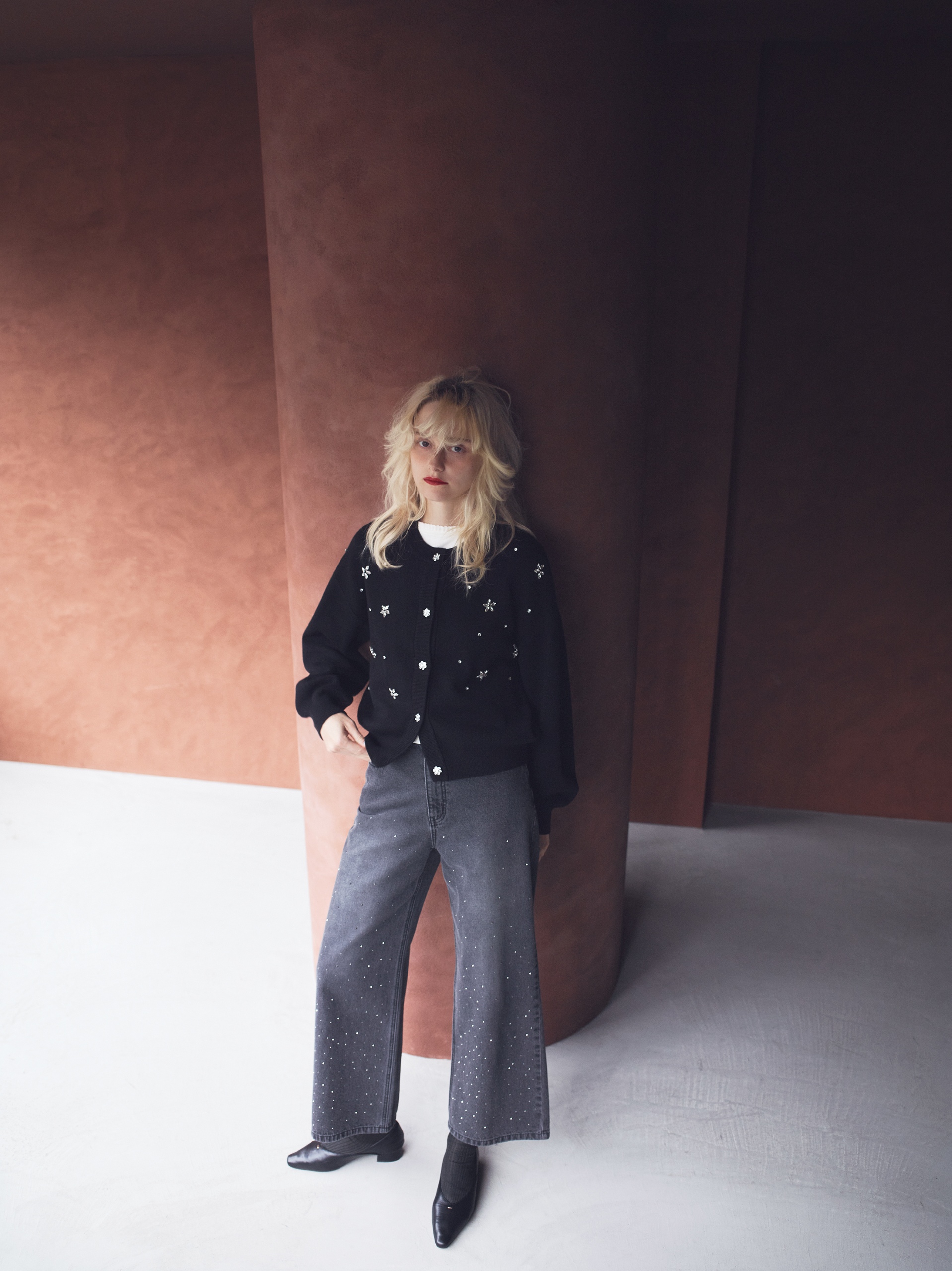 コンパクトなニットカーディガンにクリスタルのビジューをあしらった、キレイめな印象のまま華やかさをおぎなえる1枚。ちょっとしたイベントなど、日常の中で少し特別感のある仕上がりにしたいときは、小粒のビジューがついたデニムで、キラキラとした雰囲気を全身で演出。どちらも黒をベースにすると大人っぽくまとまる。