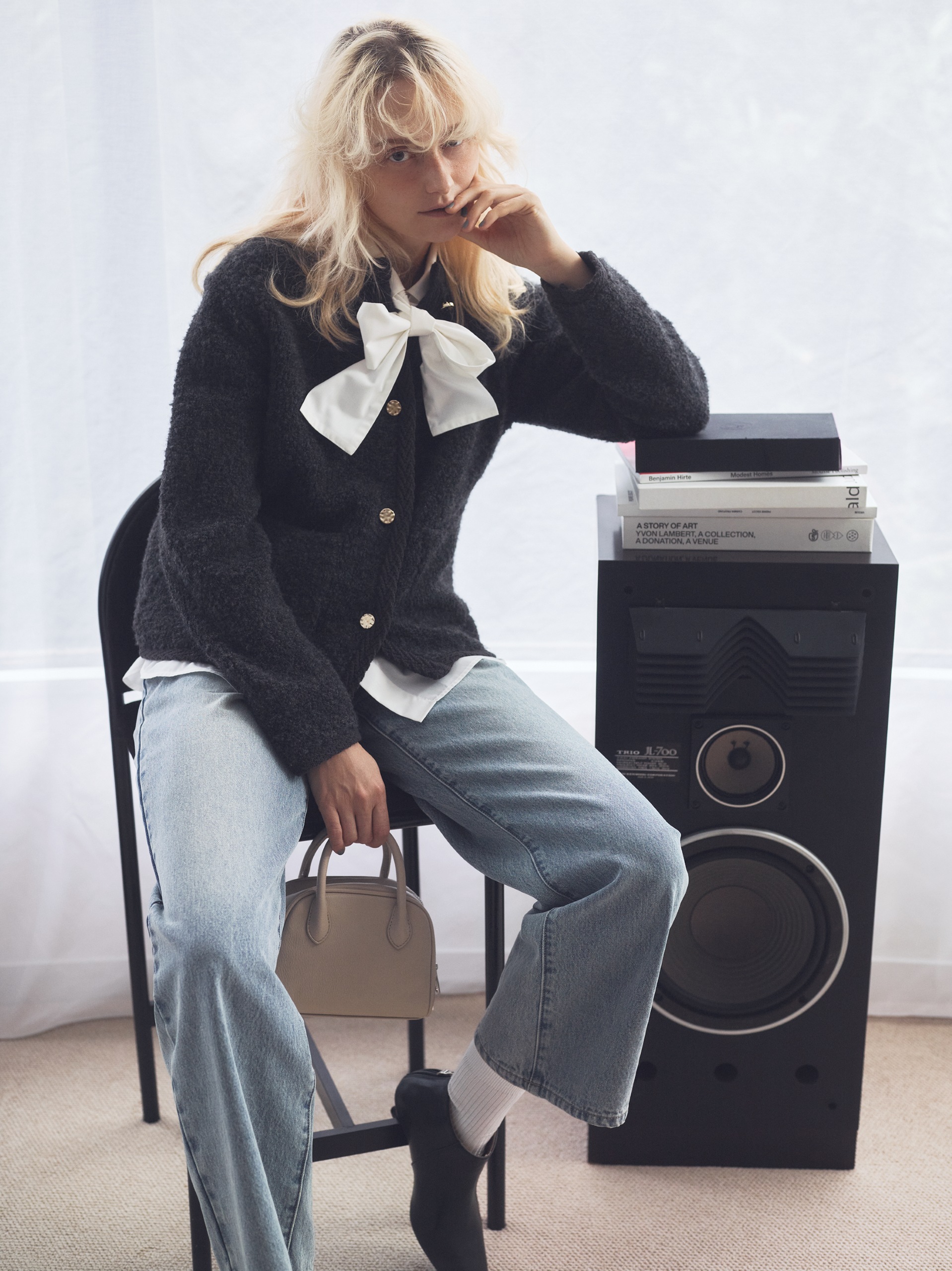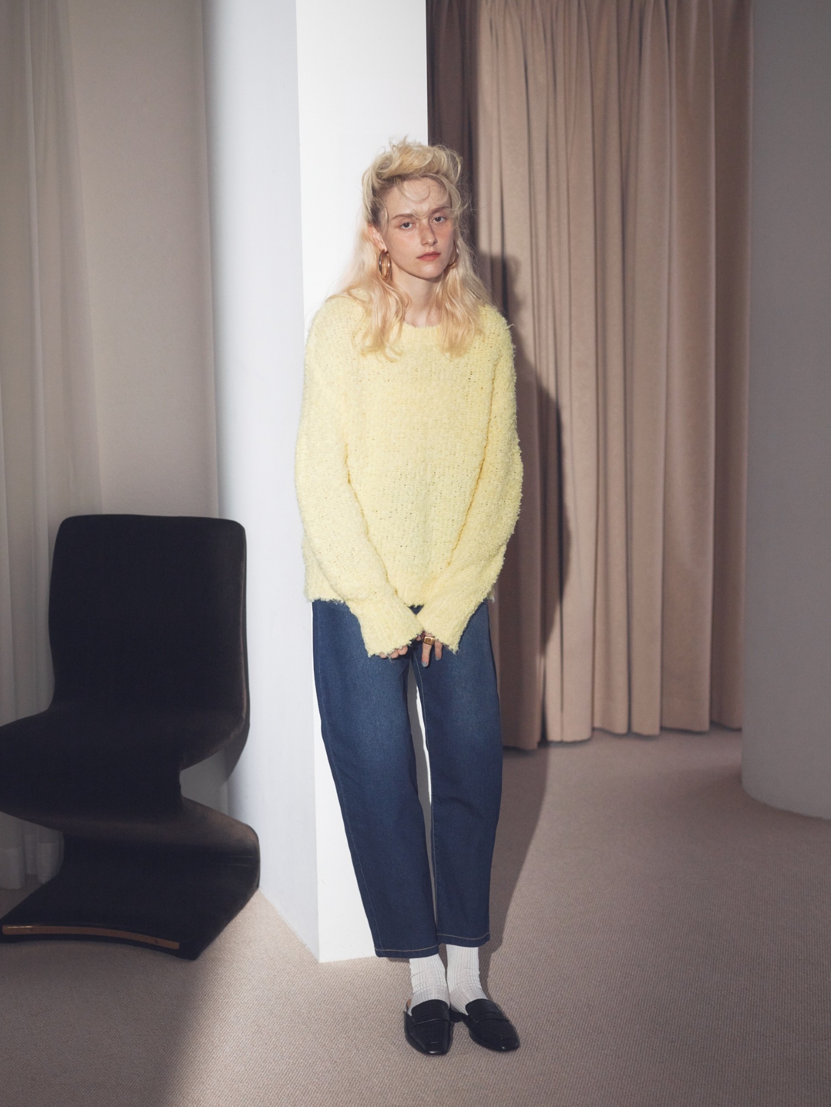 ボリュームニットにありがちなもたつき感を、軽やかな色で解決。ブークレの立体的な風合いで、ゆったりとしたデニムと合わせたときも奥行きが出る。華やかなのに派手に見えないエクリュ寄りのイエローは、デニムに限らずベーシックカラーのボトムにも好相性。